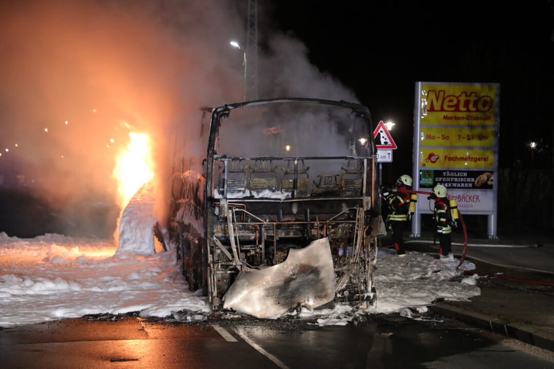Am 01.03.2026 kam es gegen 4.05 Uhr auf der Dresdner Straße (S 194) in Tharandt zu einem Fahrzeugbrand. Kurz vor dem Busbahnhof war ein Reisebus VDL in Brand geraten. Als die Freiwillige Feuerwehr Tharandt eintraf, stand der Bus komplett in Flammen. Die 20 Fahrgäste und die beiden Busfahrer hatten den Bus bereits unverletzt verlassen. Die Passagiere hatten Glück. Ihre Reise sollte planmäßig am Busbahnhof enden. So konnten sie nach dem „heißen“ Abschluß ihrer Reise gleich den Heimweg antreten. Mit mehreren Strahlrohren, mit Wasser und Schaum löschten die Feuerwehrleute den Brand. Der Reisebus war nicht mehr zu retten und brannte vollständig aus. Die Dresdner Straße war wegen des Einsatzes zwischen Tharandt und Freital gesperrt. Die Polizei ermittelt zur Brandursache.