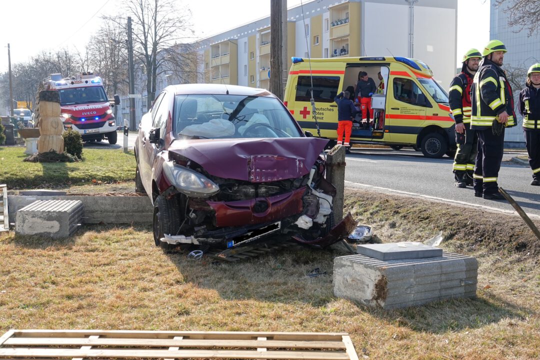 Mittwochmittag kam es gegen 13.15 Uhr auf der Bahnhofstraße in Klingenberg zu einem Verkehrsunfall. Kurz vor dem Ortsausgang in Richtung Grillenburg prallte ein PKW Mazda 2 gegen eine Mauer, einen Zaun und einen Telefonmast. Anschließend blieb der Kleinwagen auf einem Grundstück stehen. Möglicherweise lösten gesundheitliche Probleme der Mazdafahrerin den Unfall aus. Die Freiwillige Feuerwehr Klingenberg unterstützte den Rettungsdienst und zog die Verletzte aus dem Fahrzeug. Die Frau wurde unter Begleitung des Notarztes ins Krankenhaus eingeliefert. Der Mazda wurde erheblich beschädigt. Die Bahnhofstraße (S 189) war zeitweise gesperrt. Später wurde der Verkehr an der Unfallstelle vorbeigeleitet. Der Verkehrsunfalldienst der Polizei ermittelt zur Unfallursache.