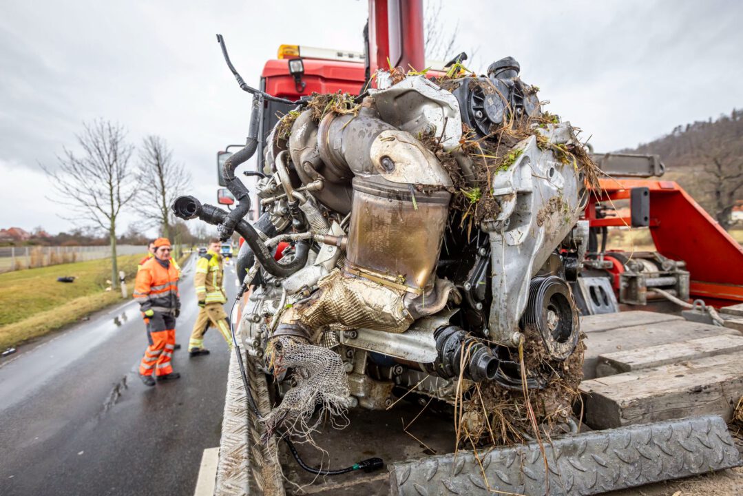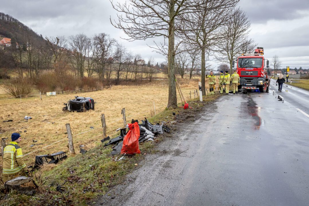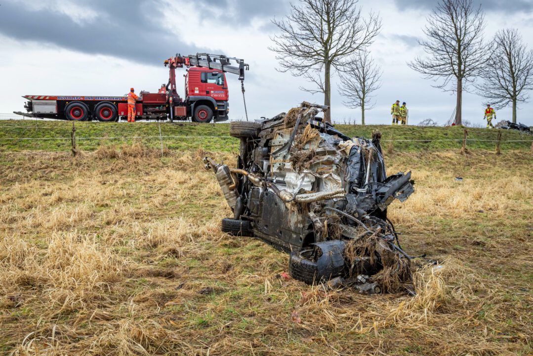 Bereits beim Aufprall und während der weiteren Fahrt lösten sich zahlreiche Fahrzeugteile, Trümmer flogen umher. Unten an der Böschung durchbrach der Golf einen Zaun und setzte seine unkontrollierte Fahrt fort. Schließlich blieb das völlig zerstörte Auto auf einer angrenzenden Wiese auf der Fahrerseite liegen – rund 20 Meter von der Fahrbahn entfernt. Die Spuren des Unfalls ziehen sich jedoch deutlich weiter: Vom Baum bis zur Endlage des Fahrzeugs erstreckt sich die Unfallstrecke über schätzungsweise 50 Meter. Der Frontbereich wurde vollständig zerstört, der Motor, Teile der Amateur aus dem Fahrzeug herausgerissen und vom Wrack entfernt aufgefunden. Der getroffene Baum verlor durch die Wucht des Aufpralls seine Spitze.